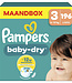 De Pampers Baby-Dry Maat 3 biedt langdurige droogheid en bescherming voor baby's en peuters van 6 tot 10 kg. Dankzij de Stop & Protect Pocket en dubbele beschermrandjes wordt doorlekken rond de beentjes tot een minimum beperkt. De superabsorberende kern neemt vocht snel op en houdt het vast, terwijl de rekbare zijkanten zorgen voor een comfortabele en aansluitende pasvorm.