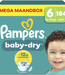 De Pampers Baby-Dry Maat 6 biedt langdurige droogheid en bescherming voor baby's en peuters tussen 13 en 18 kg. Dankzij de Stop & Protect Pocket en dubbele beschermrandjes wordt doorlekken rond de beentjes tot een minimum beperkt. De superabsorberende kern neemt vocht snel op en houdt het vast, terwijl de rekbare zijkanten zorgen voor een comfortabele en aansluitende pasvorm.